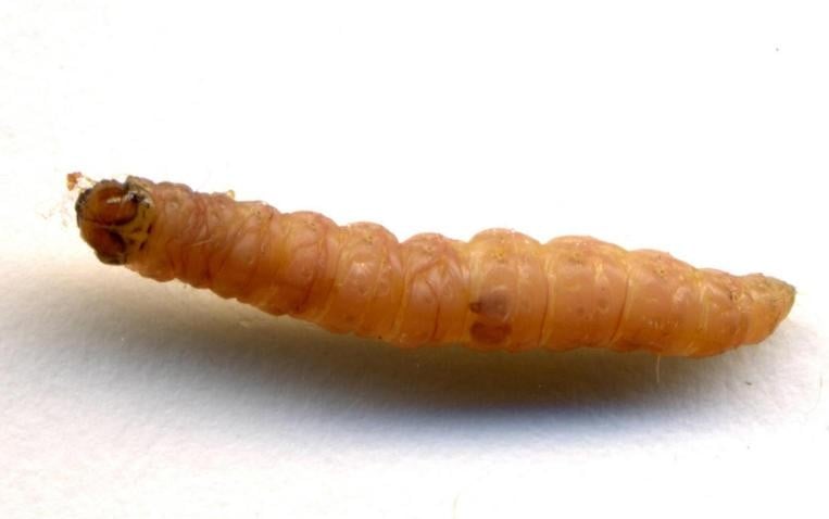 - Larvae are approximately 12 mm long, pink to red with a dark brown head.